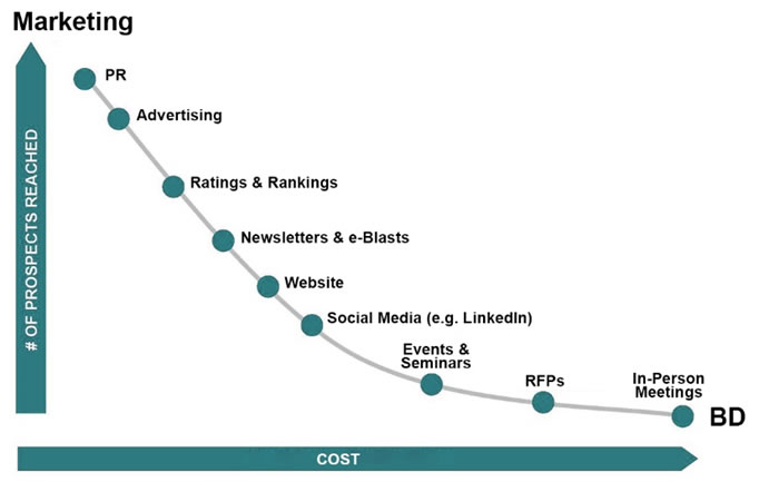 At a basic level, “Marketing” can be defined as profile-raising activities (for a lawyer or law firm). “BD,” on the other hand, focuses on those activities that will lead to either: meaningful contact with a prospective client or obtaining additional business from an existing client. The difference between Marketing and BD is not always black & white – there are grey areas. An understanding of the interplay between the two can inform a firm on how to approach various activities. Take events for example. An event can be a pure Marketing (profile-raising) activity, or an event could have a networking component (BD). But it takes a coordinated effort to get some measureable BD impact (Return on Investment, or ROI) from an event. An event can also be a cross-selling or cross-marketing opportunity, but, again, you have to put some effort into it.